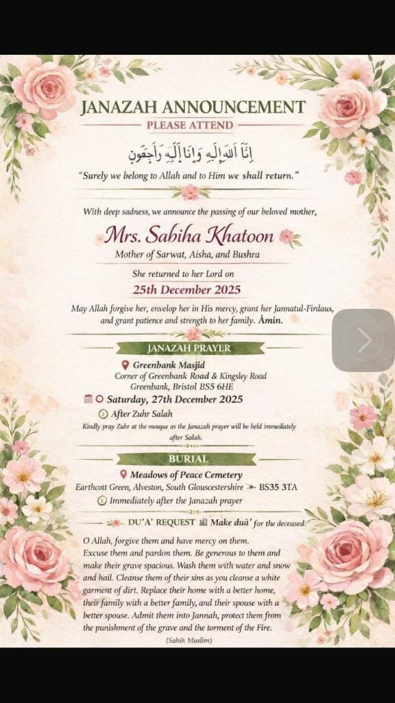 With deep sadness, we announce the passing of Mrs Sabiha Khatoon.