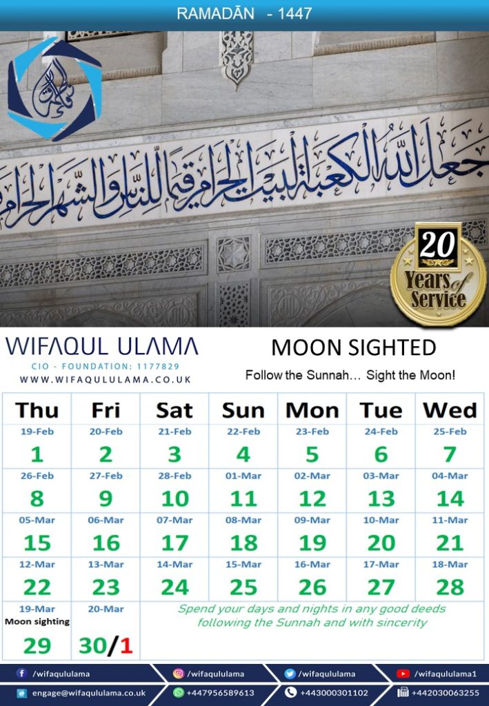 Greenbank Masjid is pleased to announce that the 1st of Ramadhan 1447 (2026) will commence on Thursday 19 February 2026.
